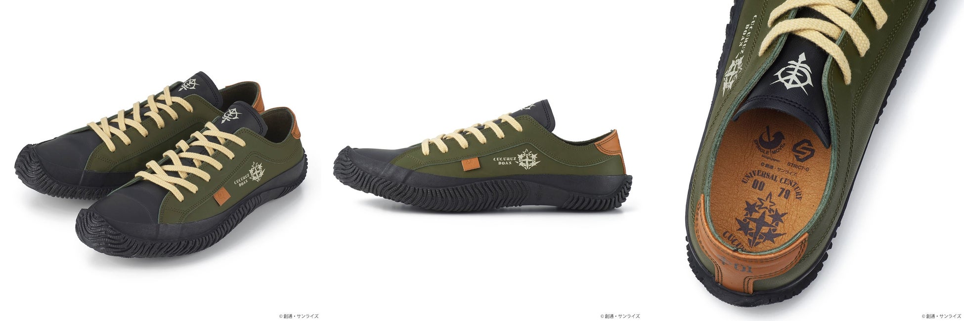 スニーカーは開発・生産を一貫して国内で行い、“バルカナイズ製法”を用いた純国産スニーカーブランド「SPINGLE MOVE(スピングルムーヴ)」とのコラボレーションによる、ククルス・ドアンがジオン公国軍のサザンクロス隊を率いていた際に搭乗していたドアン専用ザクをイメージしたレザースニーカーです。
