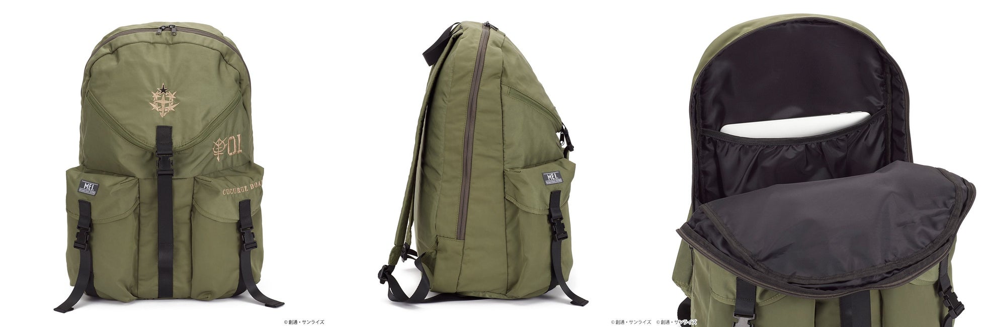 バッグはスポーツとカルチャーが入り混じるアメリカ カリフォルニア州の海岸に広がるサーフシティ“Huntington Beach”をベースに発信されるブランド「MEI」とコラボレーションした、劇中でククルス・ドアンが背負っているバッグをイメージしたデイパック。