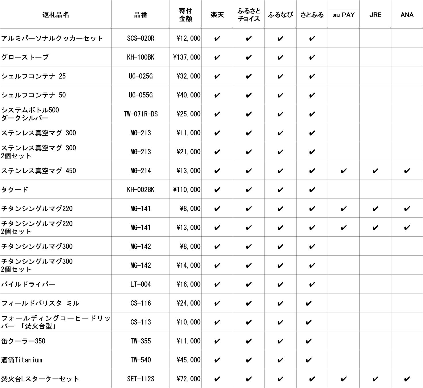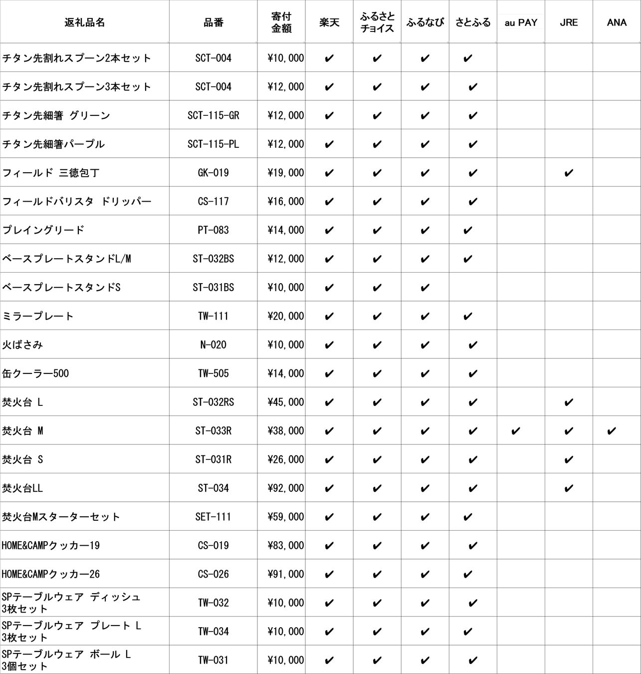 ●「焚火台Lスターターセット」や「シェルフコンテナ 25」など品切れとなった19品目を8月19日(金)20:00に楽天ふるさと納税、ふるさとチョイス、ふるなび、さとふる、JRE MALL ふるさと納税、au PAYふるさと納税、ANAのふるさと納税に出品