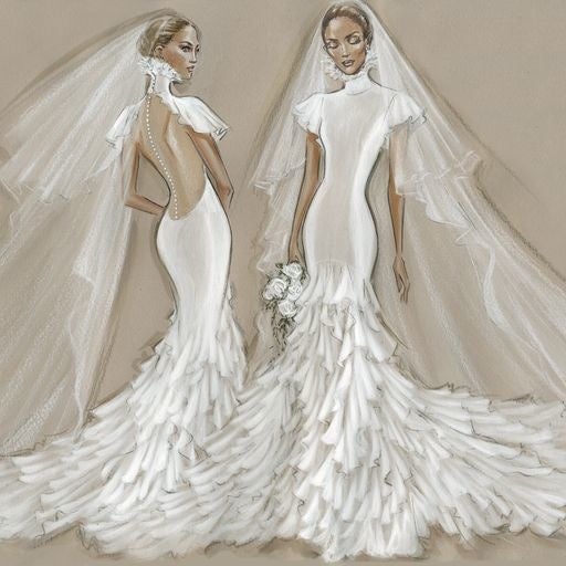 – ドレス 1:ハンカチーフ ウェディングドレスは、タートルネックのコラムドレスに新たにドラマチックなラッフルのヘムを加えたものです。1,000 枚以上のハンドカット ハンカチーフと 500m のファブリックをラッフルに裁断し、手作業で縫い合わせることで、ボリュームのあるロマンティックなスカートを作り上げました。複雑に構成された袖には、タートルネックの背面から肩にかけてドレープするカスケード状のラッフルがはめ込まれ、ロマンティックでヘリテージな感覚を醸し出しています。
