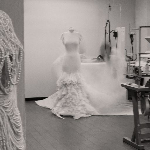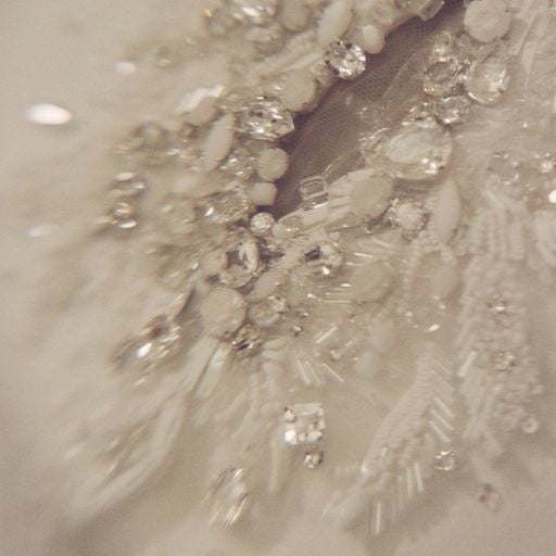 – ドレス 2:シャンデリアパール ドレスは、何千ものパールの糸が流れ落ちるように飾られています。30 人もの職人が 700 時間をかけて、シルクチュールのマイクロプリーツ、細かいパールの装飾、スワロフスキー クリスタルを手刺繍で縫い留めました。