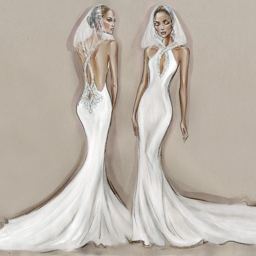 – ドレス 3:繊細なオーガンザのフードベールが取り外し可能なカスタムドレス。たおやかなマーメイドシルエットのキーホールネックには、さまざまな形とさまざまな白のニュアンスのスワロフスキー クリスタルがあしらわれ、フルスカートと組み合わされます。