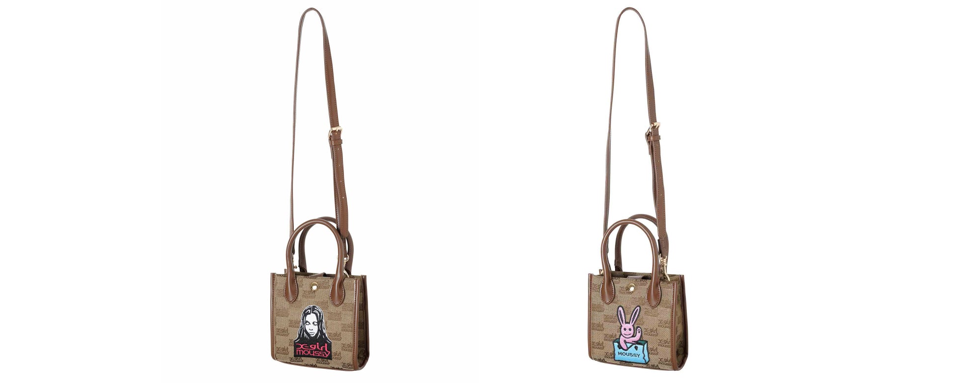 X-girlとMOUSSYのコラボレーションロゴのモノグラムを用いたジャガード生地のショルダーバッグ。X-girlのアイコニックな“フェイス”にオリジナルロゴ、“バニー”にMOUSSYのショッパーを加えたモチーフがそれぞれ刺繍で施されています。クラシカルな中に遊び心やストリートを感じるデザインです。