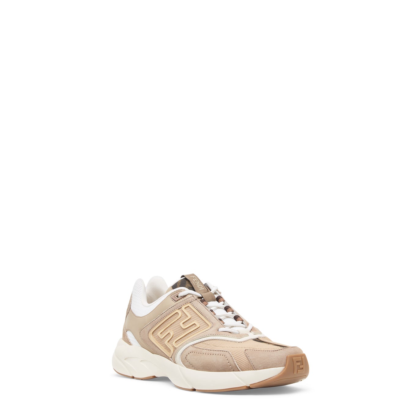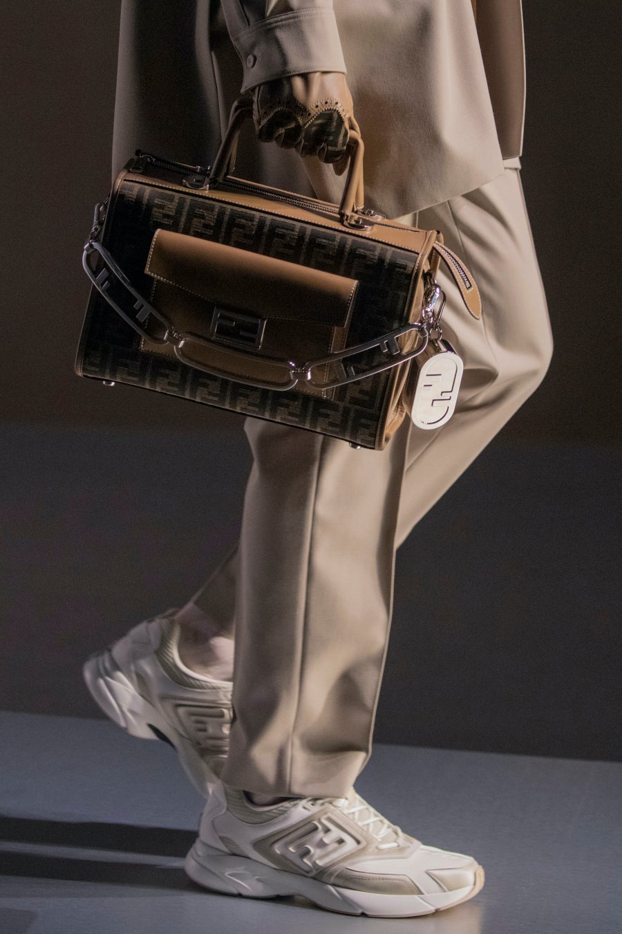 アッパーやレース、タンから後部、ソールに至るまで、アイコニックなタバコカラーとブラウンの「FF」ロゴジャカードがあしらわれています。軽さと履き心地の良さを実現するダイナミックラバーソールという革新的な構造に、トップの透明ラバーが華を添えます。さらに、シューズの先端にあしらわれた立体的な「FF」ロゴとタンのフェンディタグがシューズをフェンディらしいモダンでクールなデザインにしています。