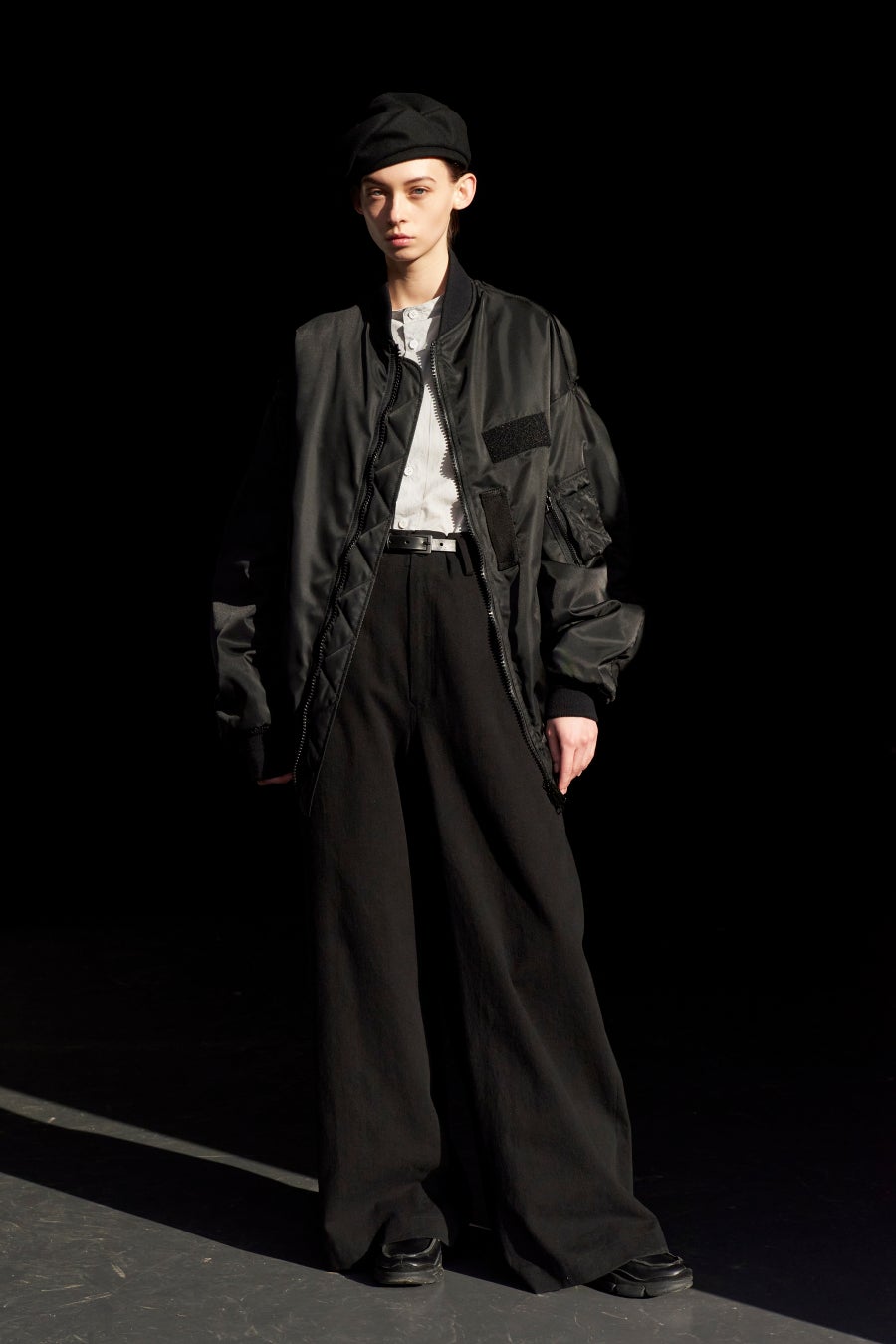 本格的な素材のMA-1を、極端なオーバーサイズで再解釈したボリュームシルエット。前下がりのヘムラインはMA-1本来のバランスでメンズライクな仕上がり。シンサレートの中綿が入った機能の高いビッグサイズジャケットに、ノーカラーのシャツ、ドレープが裾に向かってまっすぐしなやかに落ちる様にパターンメイキングされたハイウエストワイドパンツを合わせ、ミリタリーをコンテンポラリーに表現。