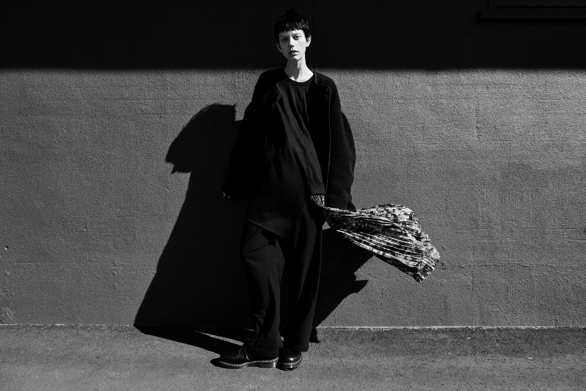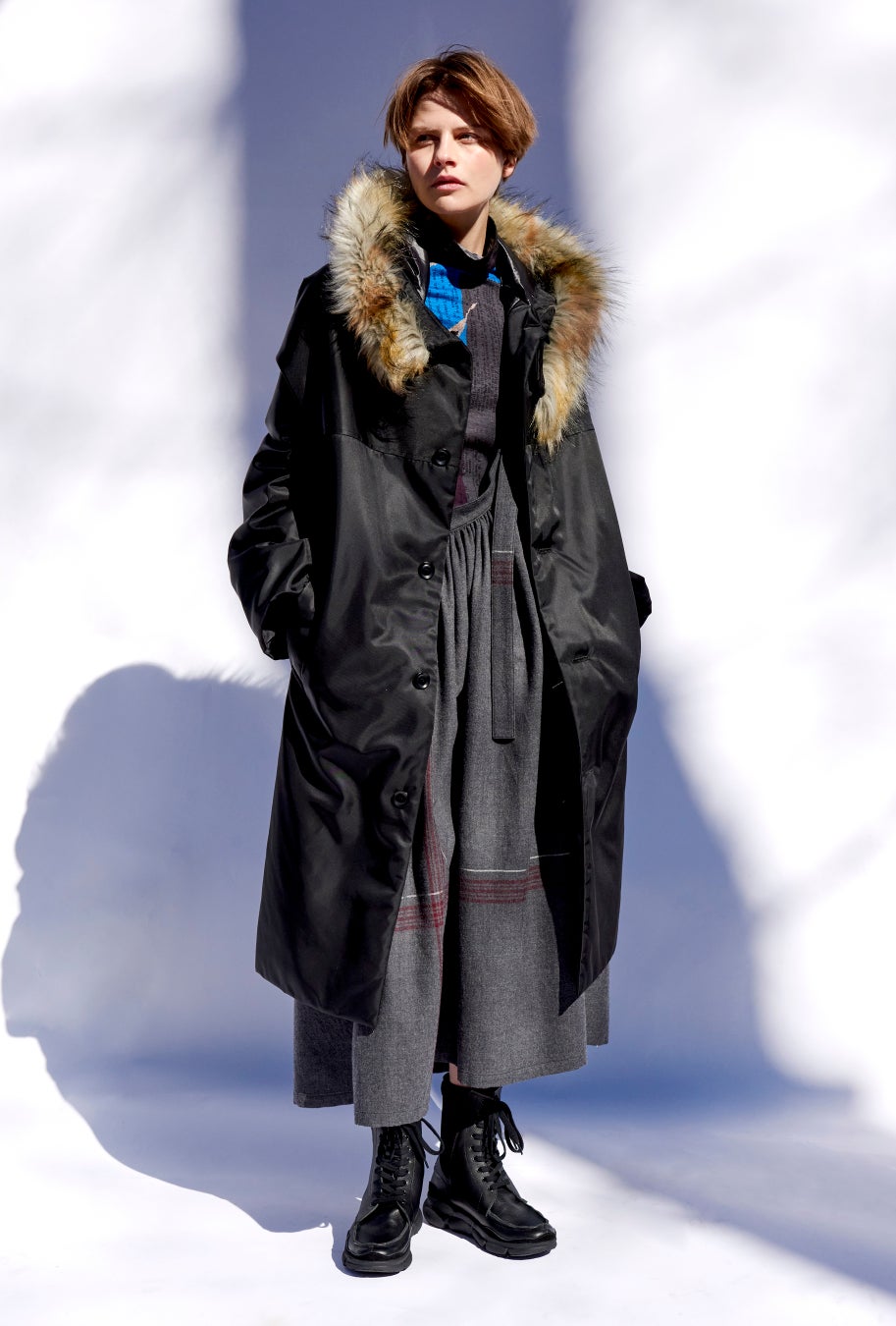 カットソーとプリーツを組み合わせた印象的な非対称ドレス。プリーツ部分だけロングになったドレスは、パンツと合わせるレイヤードを提案。ライナーを着想源としたノーカラージャケットを羽織り、風になびくプリーツが冬らしく美しい。ドロップショルダーのディテールがつくるコクーンシルエットが特徴のジャケットは、プードルのようなカーリーな毛足が特徴のウールボアの表と、裏はフラットなポリエステルの両面組織のアウター素材で、リバーシブルで着ることが可能。アウトドアテイストを、ワイズらしいオーバーサイズとシルエットで再解釈し、日常に馴染む上品な表現に変えています。