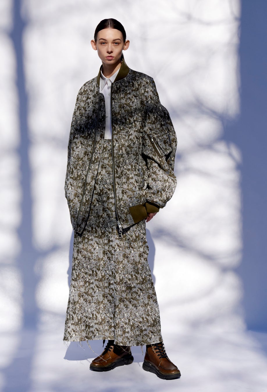 袖付けにマチが入ったドロップショルダーでボリューム感が強調された極端なオーバーサイズのMA-1。前下がりのヘムラインはMA-1本来のバランスでメンズライクな仕上がりに。アクションペインティングのような迷彩のジャカード織りが印象的な今シーズンのシグネチャーピース。キルティングが施された裏面を表にして着ることも可能。白シャツを合わせたジャケットスタイルのような着こなしと、シックな総柄で個性のある強い佇まい。