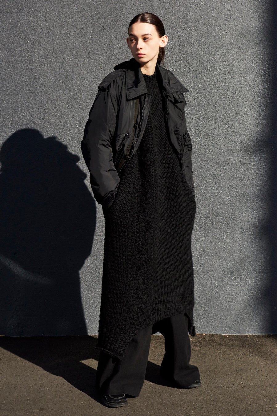 フライトジャケットを着想源としたブルゾン。防寒性の高い大きな襟にはチンストラップが一体となり、フードは後襟ぐりに付いたジッパーで取り外しが可能。程よくボリューム感のあるコンパクトなトップス、裾の形状が変形したロングニット、ドレープがまっすぐしなやかに落ちるワイドパンツを合わせた、ユニークでミニマル、コンテンポラリーなスタイル。