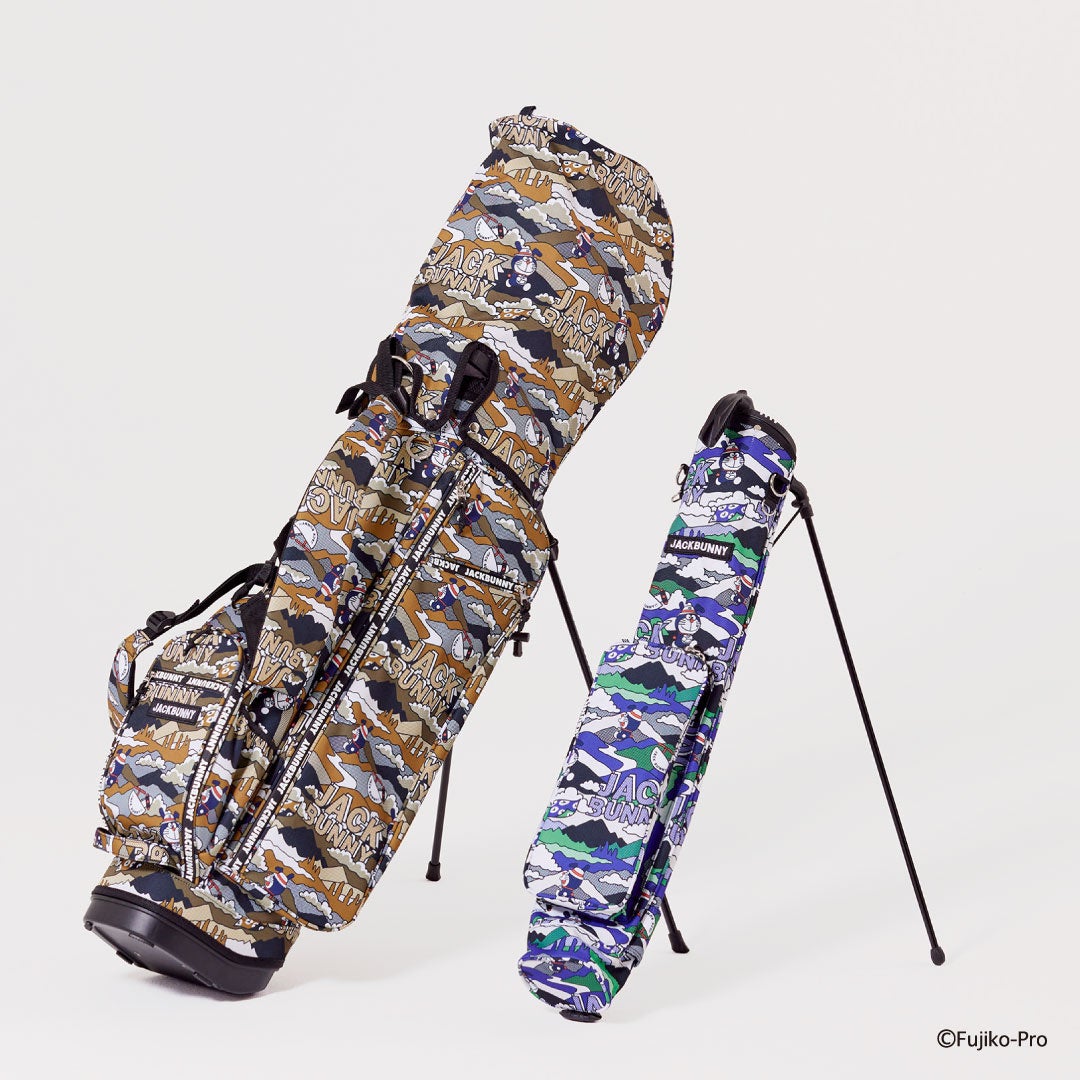 オリジナルのハイキング柄のデザインにはハットを被ったドラえもんが所々に配されたカモフラージュデザインのスタンドタイプ。タータンチェック柄にはゴルフをするドラえもんとドラミちゃんがデザインされた自立タイプで展開。