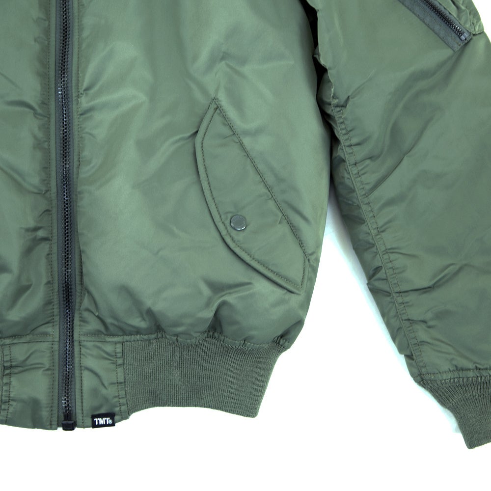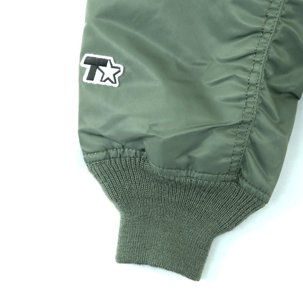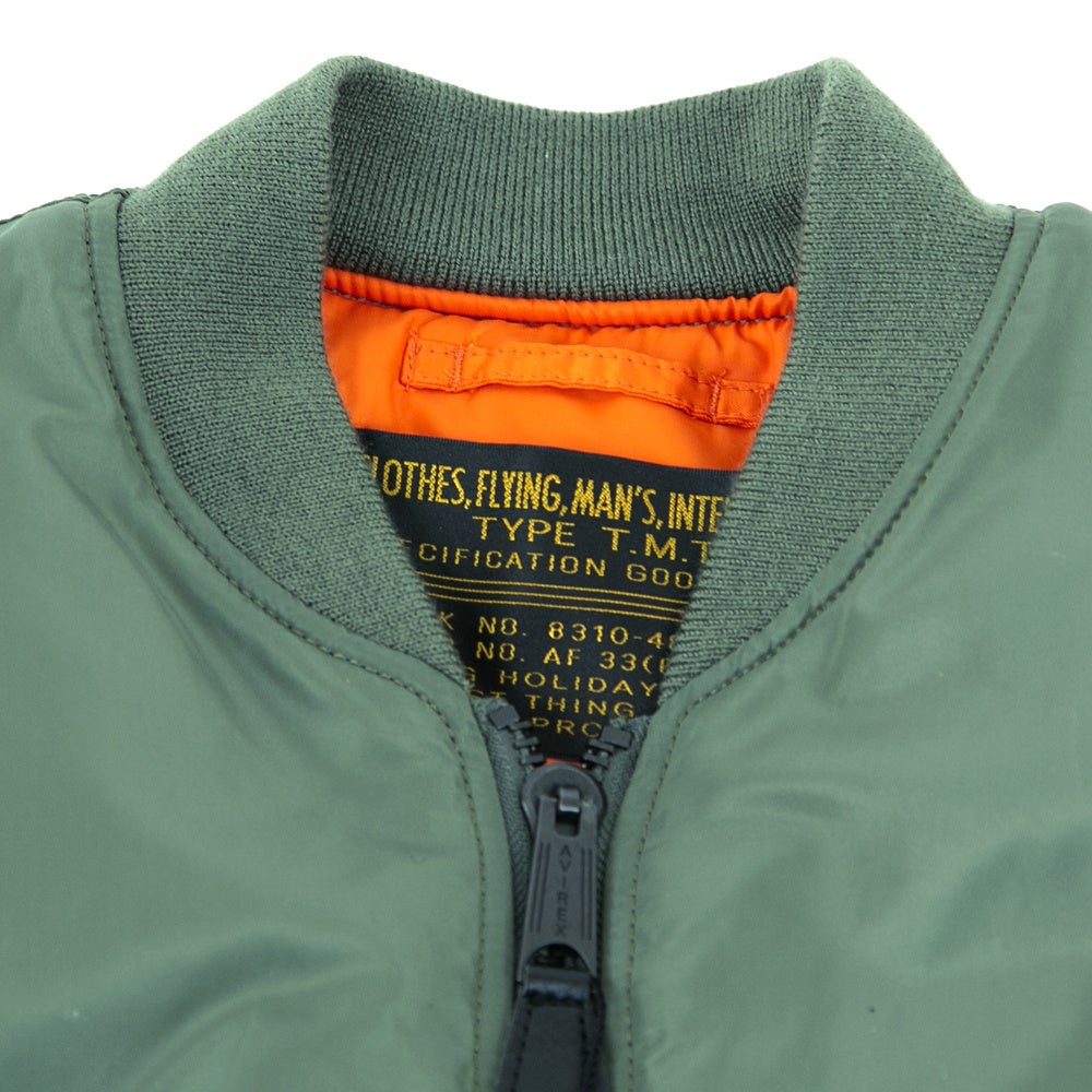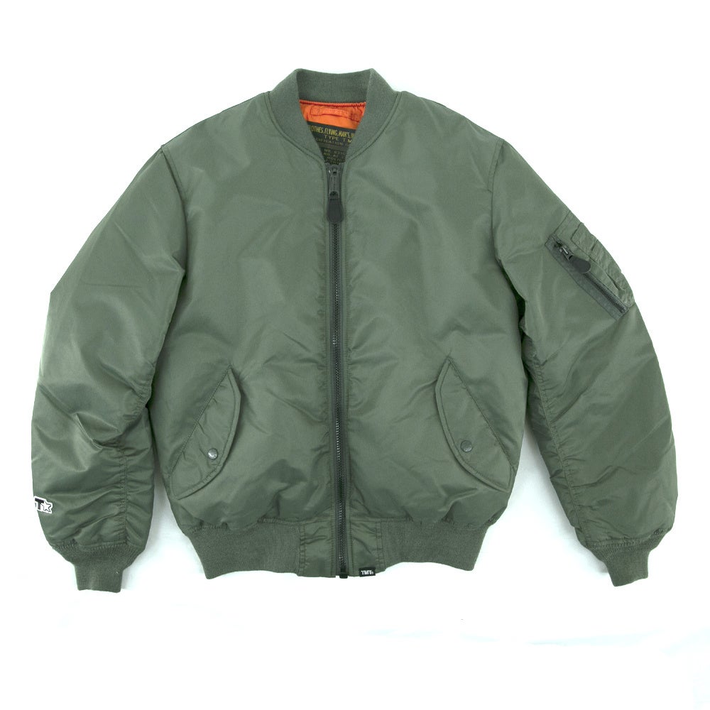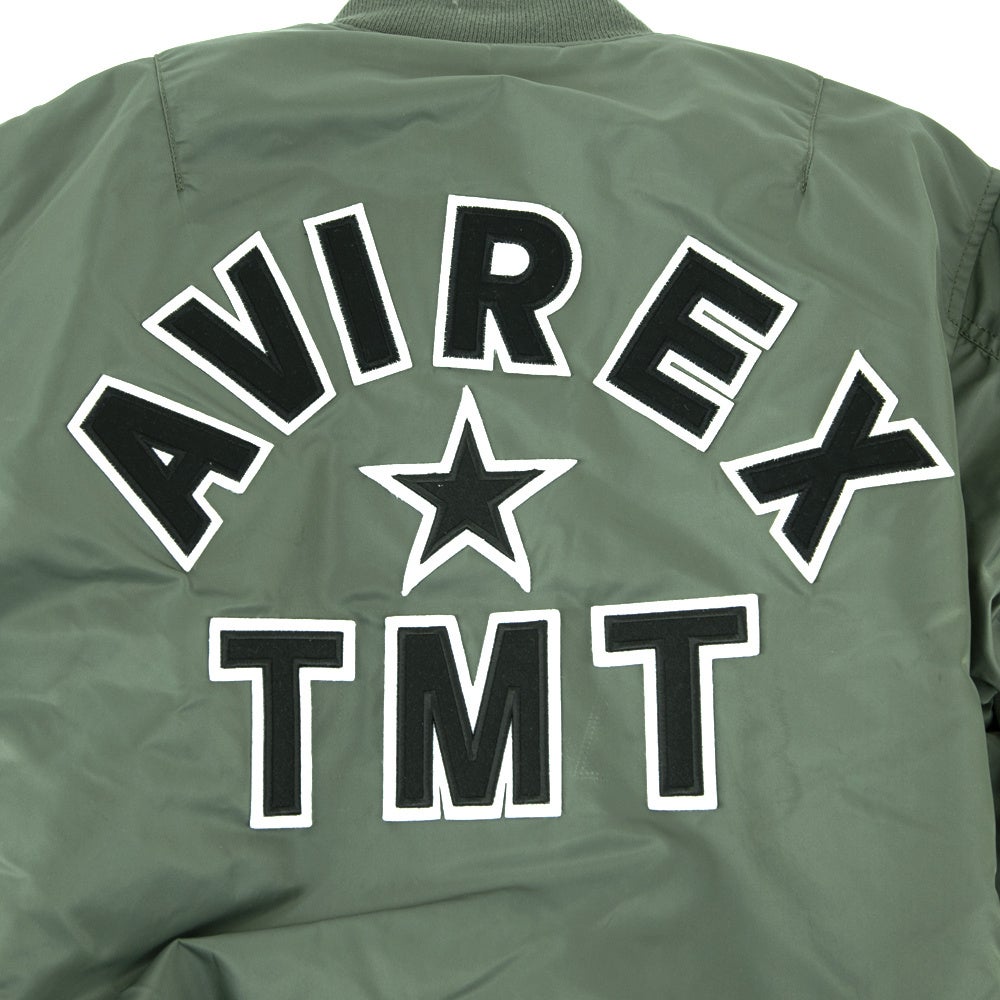 60年代に採用されたオレンジ色のライニングと、フラップ付きポケットを兼ね備えた一般的なMA-1ディテールのコマーシャル(民間向け)モデルの背中に、オリジナルの「AVIREX」のアップリケロゴとコラボレーションらしく、堂々とTMTロゴを取り付けました。