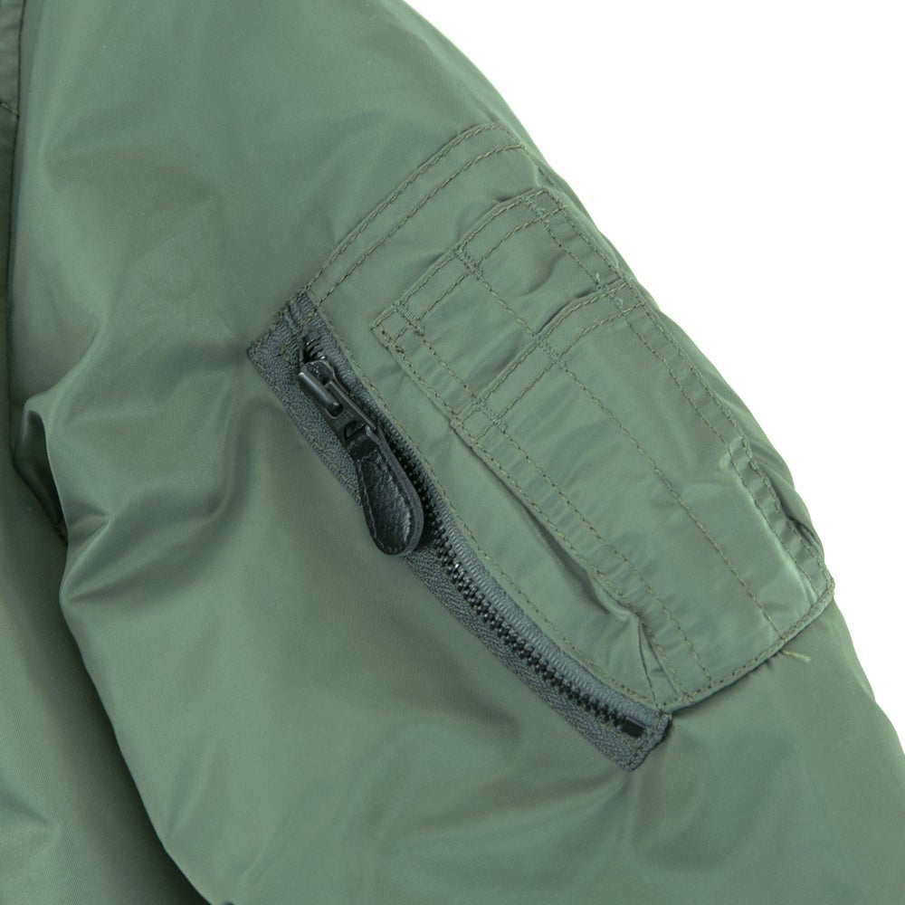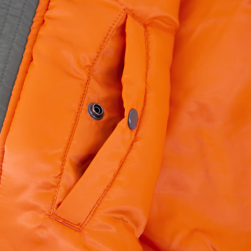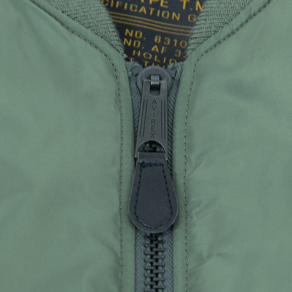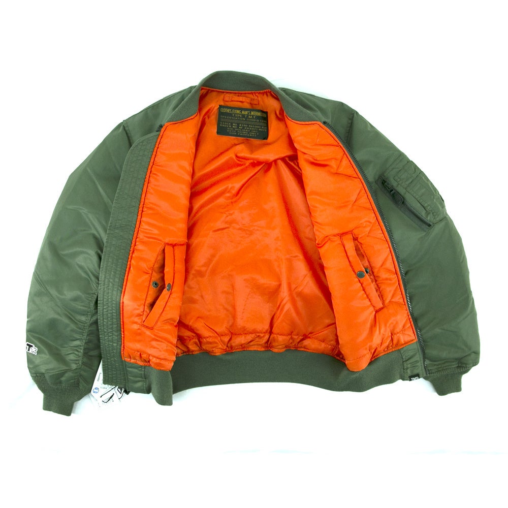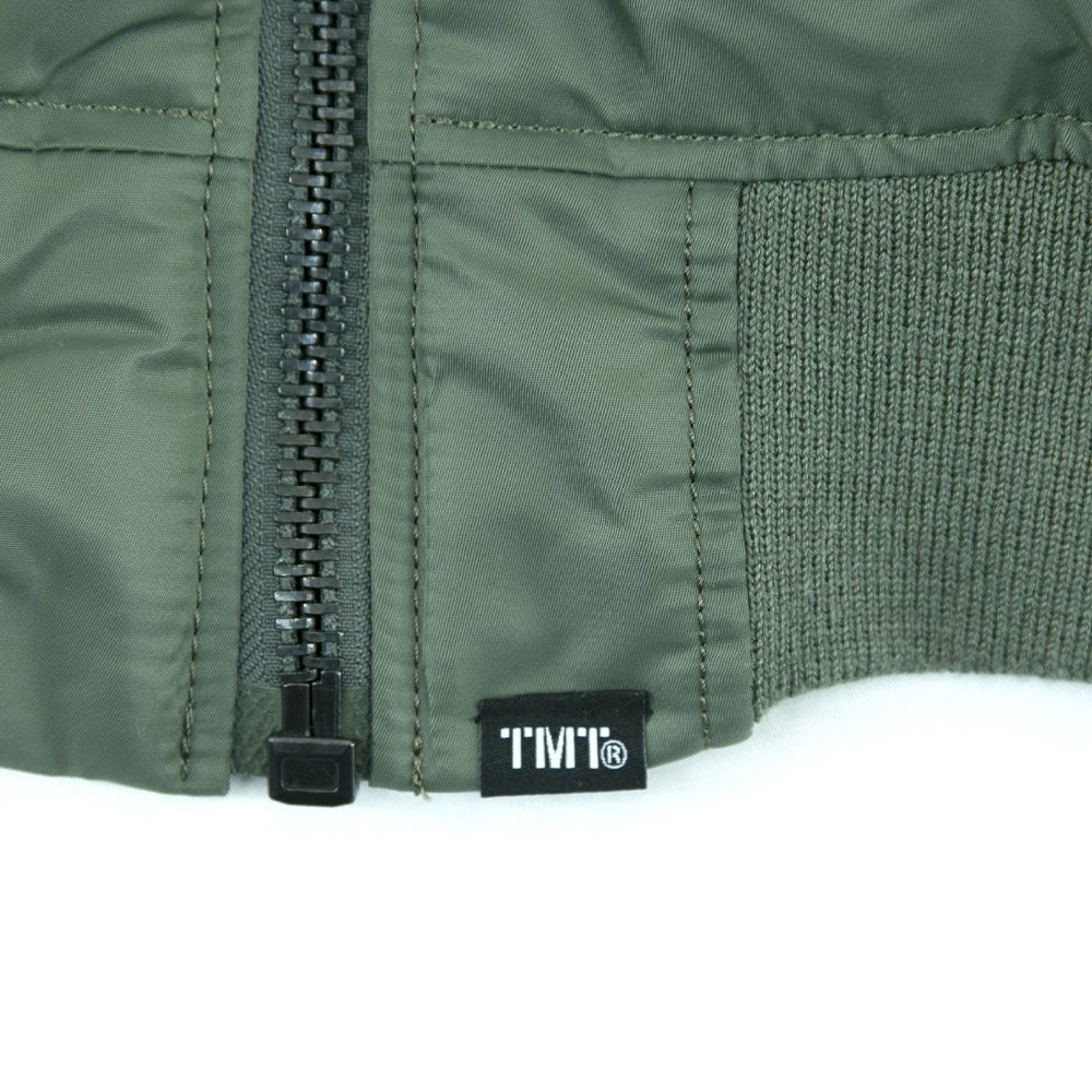 60年代に採用されたオレンジ色のライニングと、フラップ付きポケットを兼ね備えた一般的なMA-1ディテールのコマーシャル(民間向け)モデルの背中に、オリジナルの「AVIREX」のアップリケロゴとコラボレーションらしく、堂々とTMTロゴを取り付けました。