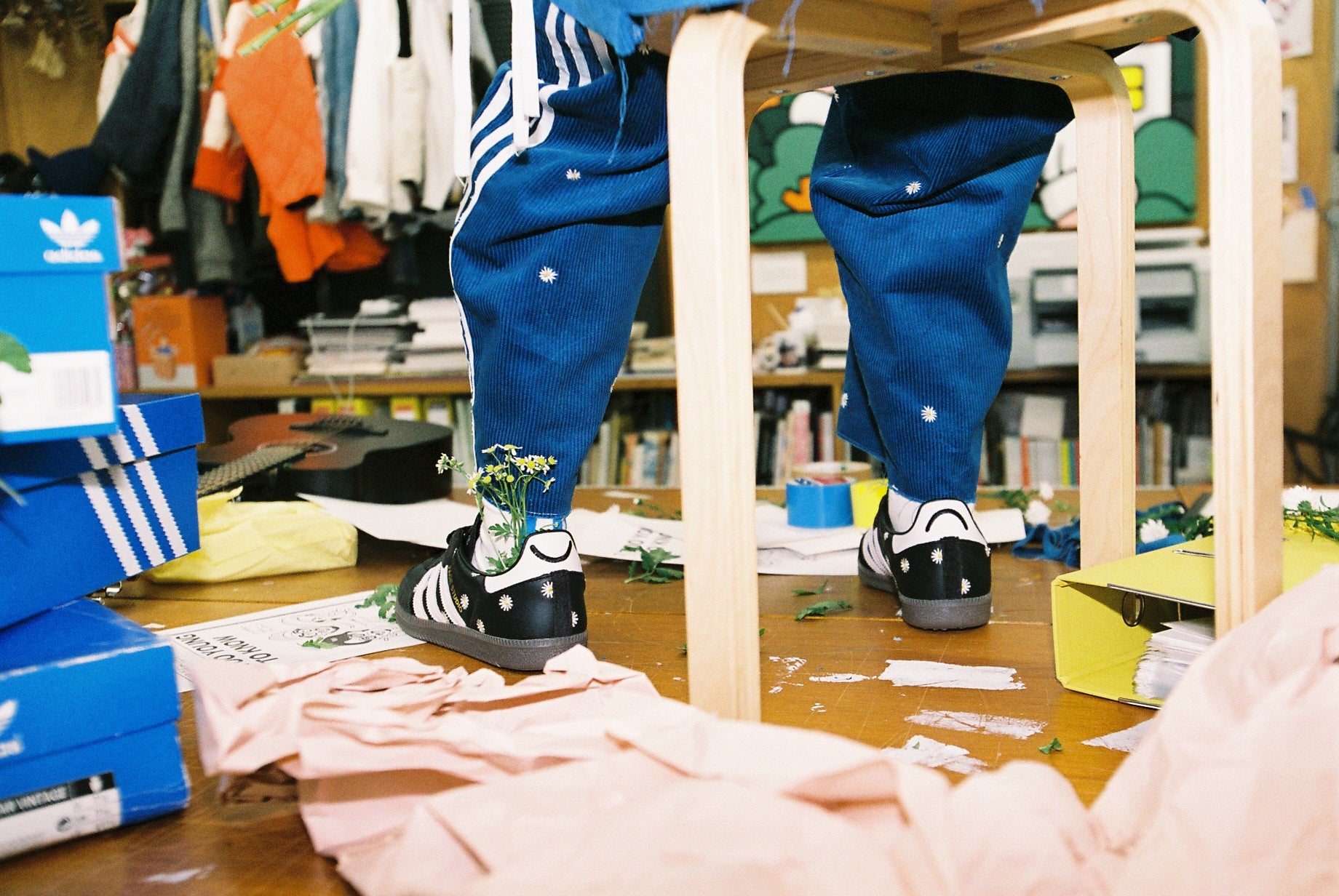 自身が幼少期に兄のSAMBAを勝手に履いていた頃から「adidasといえばSAMBA」というFACE氏の思い入れから選ばれており、普段から自身の作品で用いる花を全面に配しながら、ベルベットを採用したエレガントな雰囲気に。