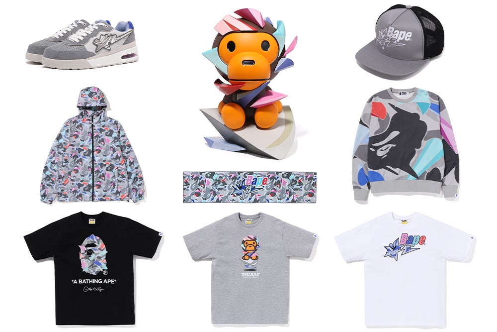 今回のコラボレーションでは、アパレル、グッズ、フットウェアを発売。BAPE®︎のシグネチャーであるBAPE®︎ CAMO、APE HEAD、BAPE STA LOGO、BABY MILO®︎などに彼の代名詞であるカラーリング、幾何学的な抽象画のスタイルをアクセントとして加えています。