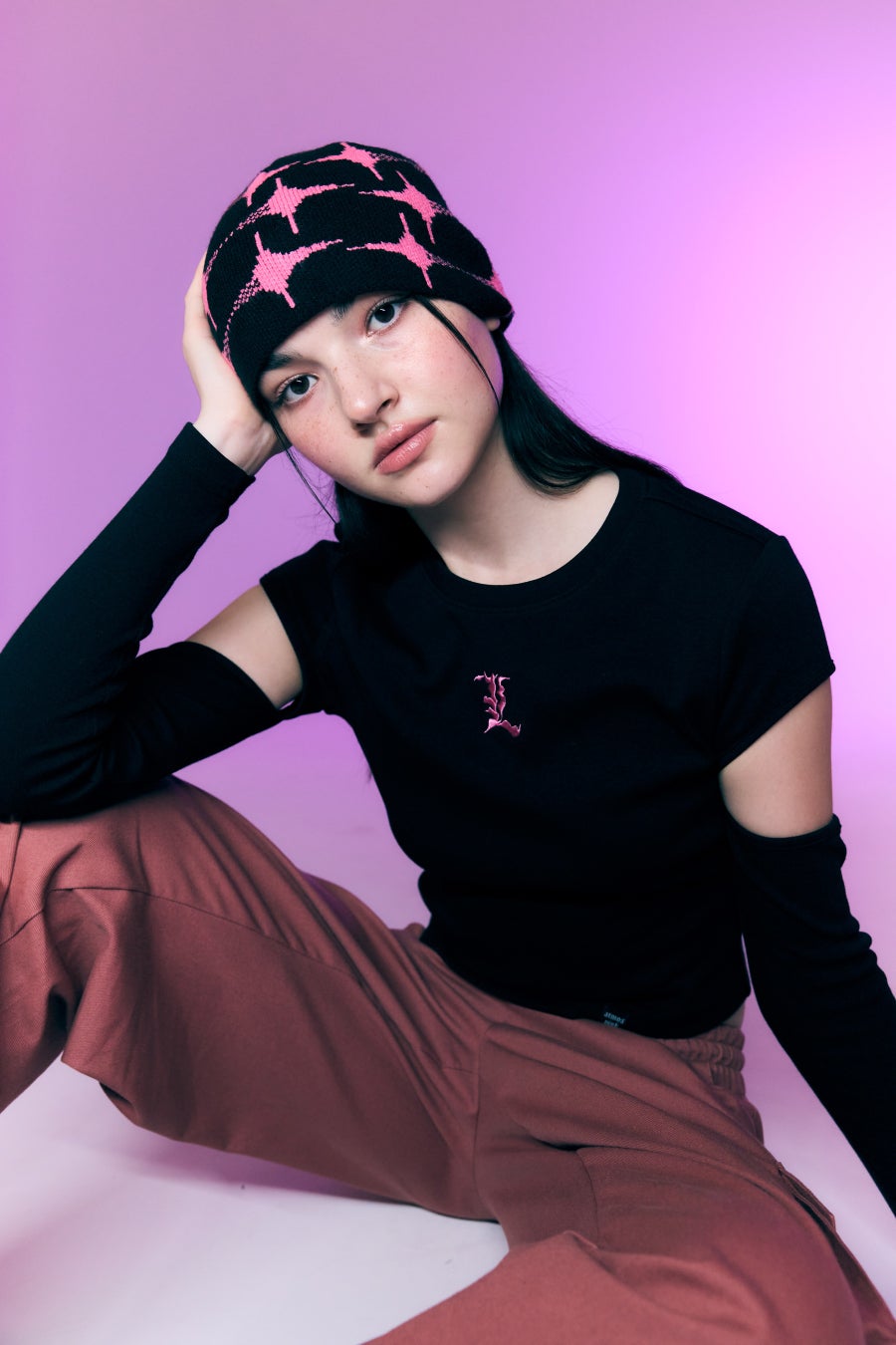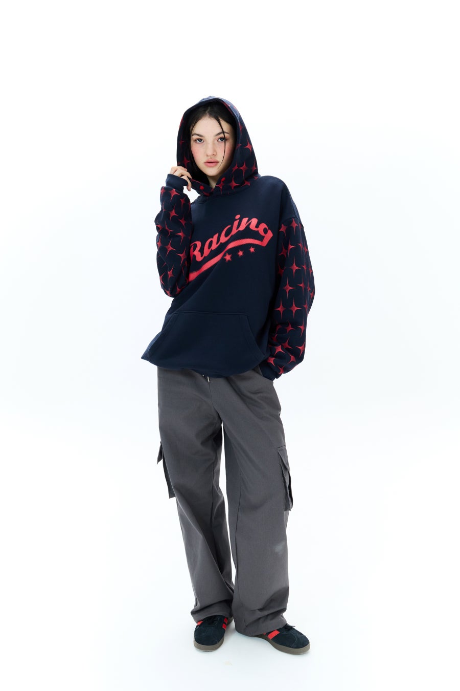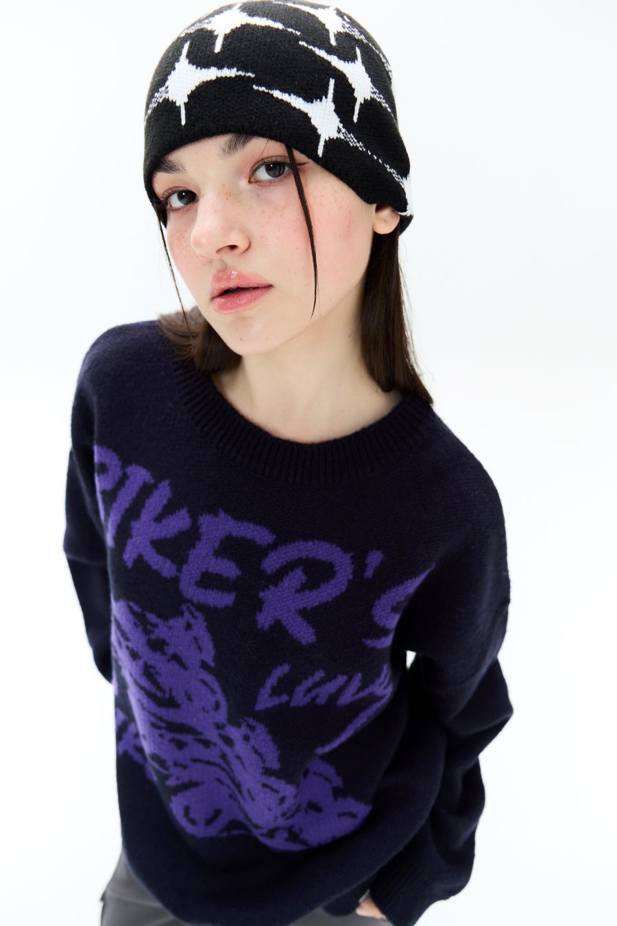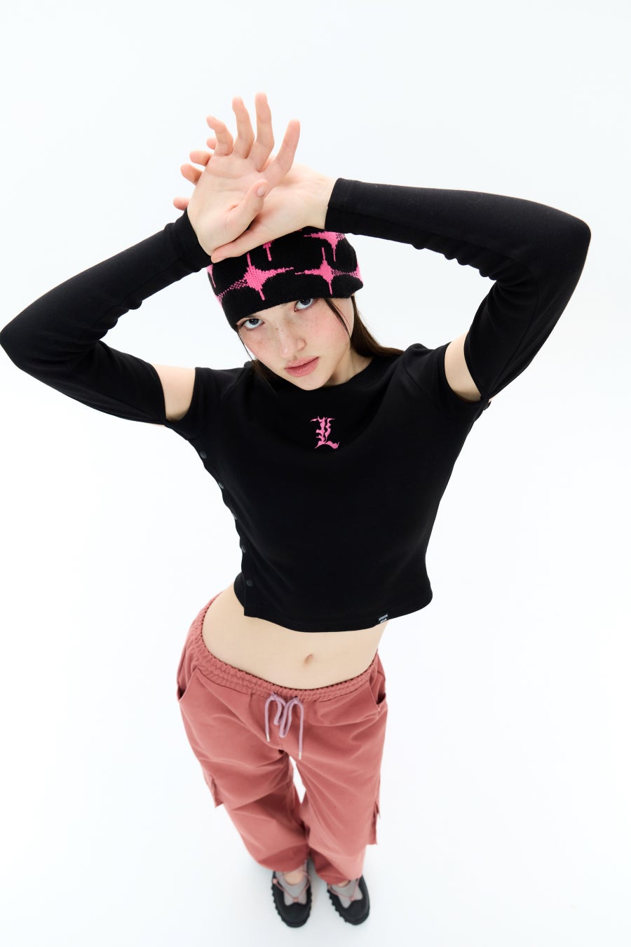 今回のコラボレーションのテーマは「バイカー」。ダイヤの総柄がポイントのBEANIE、ジャガード編みされたバイカーグラフィックが特徴のKNIT、カットアウト仕様と胸元のL刺繍が目を惹くL/S TEE、フロントにRacingロゴが大胆にプリントされたHOODIE、裾のドローコードでシルエットが変えられるCARGO PANTSの計5アイテムが発売です。