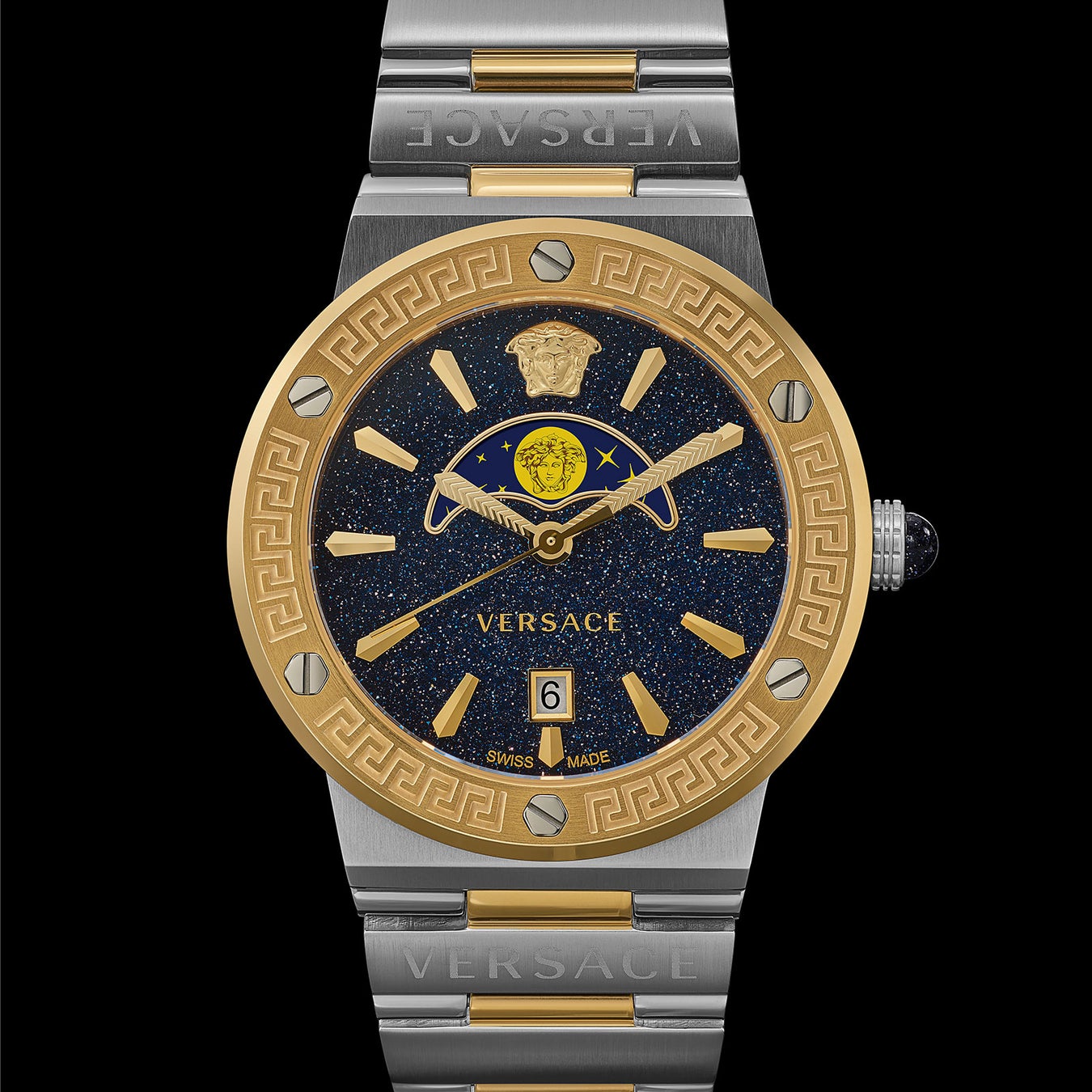 「GRECA LOGO MOONPHASE (グレカ ロゴ ムーンフェーズ)」は、月の満ち欠けを確認できるムーンフェーズ機能を、12時位置に大胆に搭載した、エレガントなコレクションです。優雅なアベンチュリンブルーの文字盤にあしらった、月に見立てたアイコニックなメドゥーサが、ロマンティックな存在感を放ちます。また、トップリングのスクリュー装飾と交互に配されたグレカモチーフやブレスレットのロゴなど、ブランドの伝統がディティールの随所に宿っています。幾何学的なフォルムとフェミニンなスタイルを組み合わせた、現代的なタイムピースになっています。