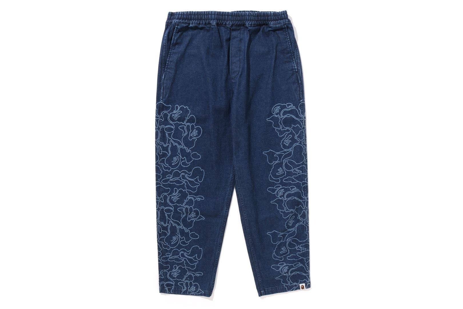 デニムシャツとデニムパンツには、BAPE®︎ CAMOと30周年記念ロゴなどをレーザープリント。シャツの背面のシックな30周年ロゴや、パンツのヒップにあしらった「猿人不打猿人」の文字などが印象的です。