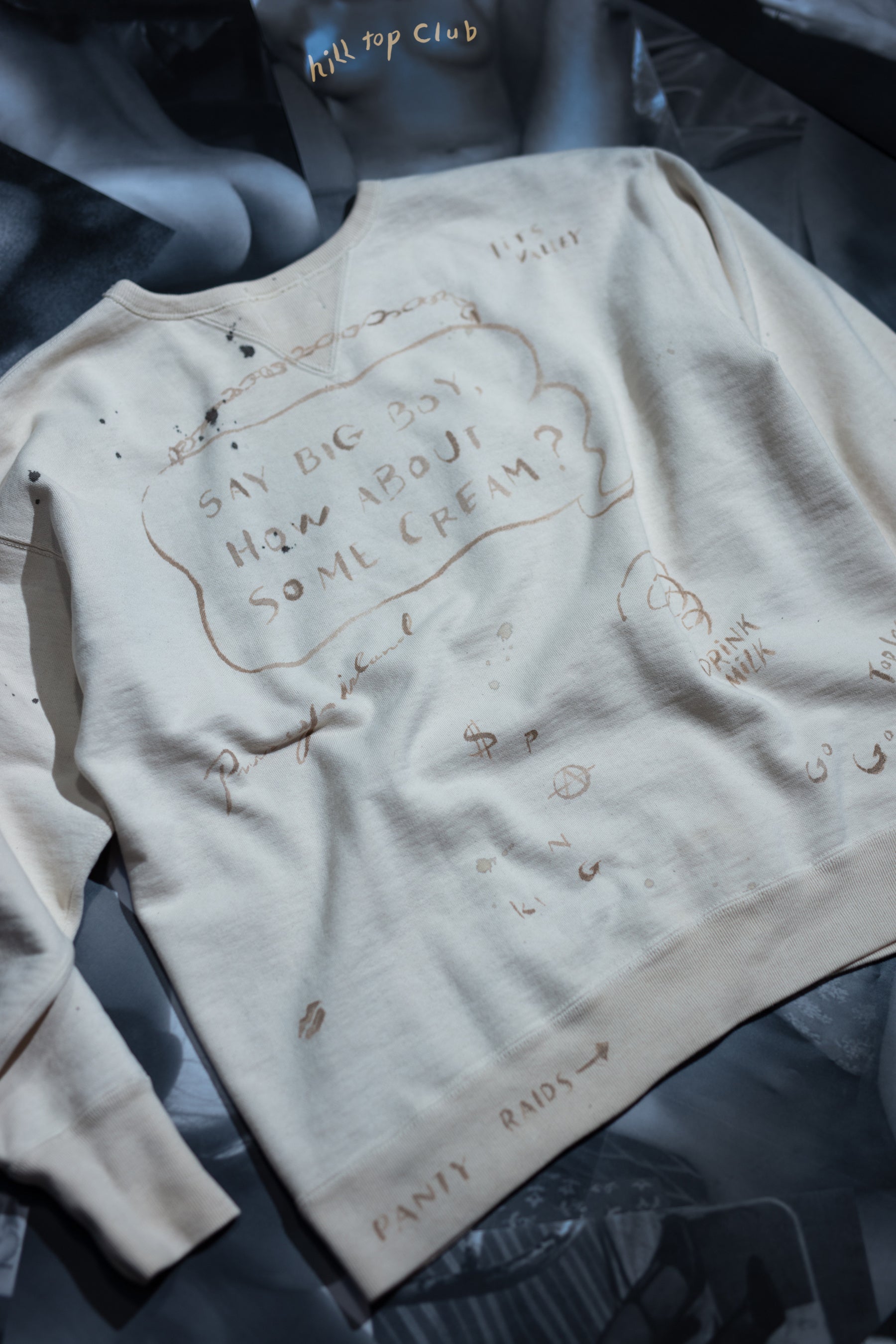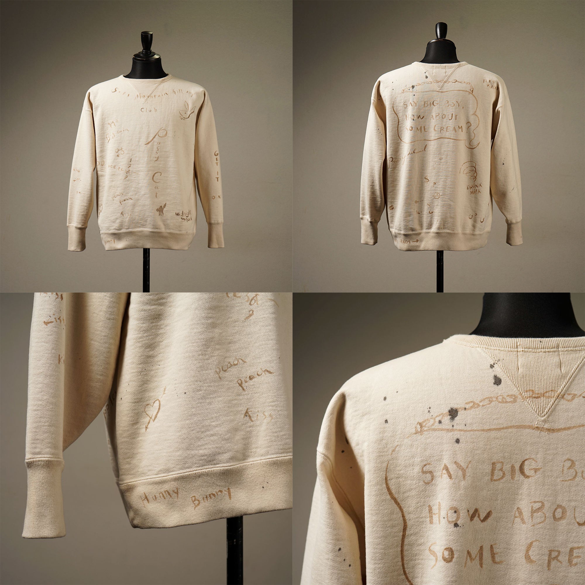 「ひとつひとつハンドペイントで仕上げられたオリジナル丸胴スウェットは表糸にカリフォルニア産の原綿を使用し、オープンエンド紡績機で米綿の特徴である短く太い繊維で作られた糸を使用しています
