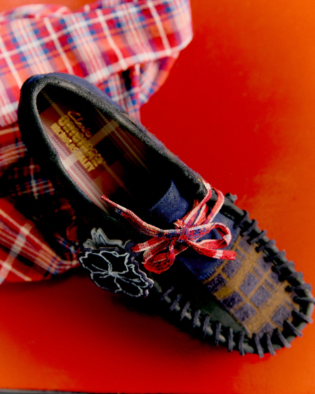 プレミアムスエード、ワックスドレザー、ヘアリースエードを組み合わせ、ヴァンプとヒールには独自のレザーステッチを施しました。さらに、フラワーフォブやタータン生地のシューレースがアクセントとなり、クラシックなシルエットに現代的な個性を与えています。