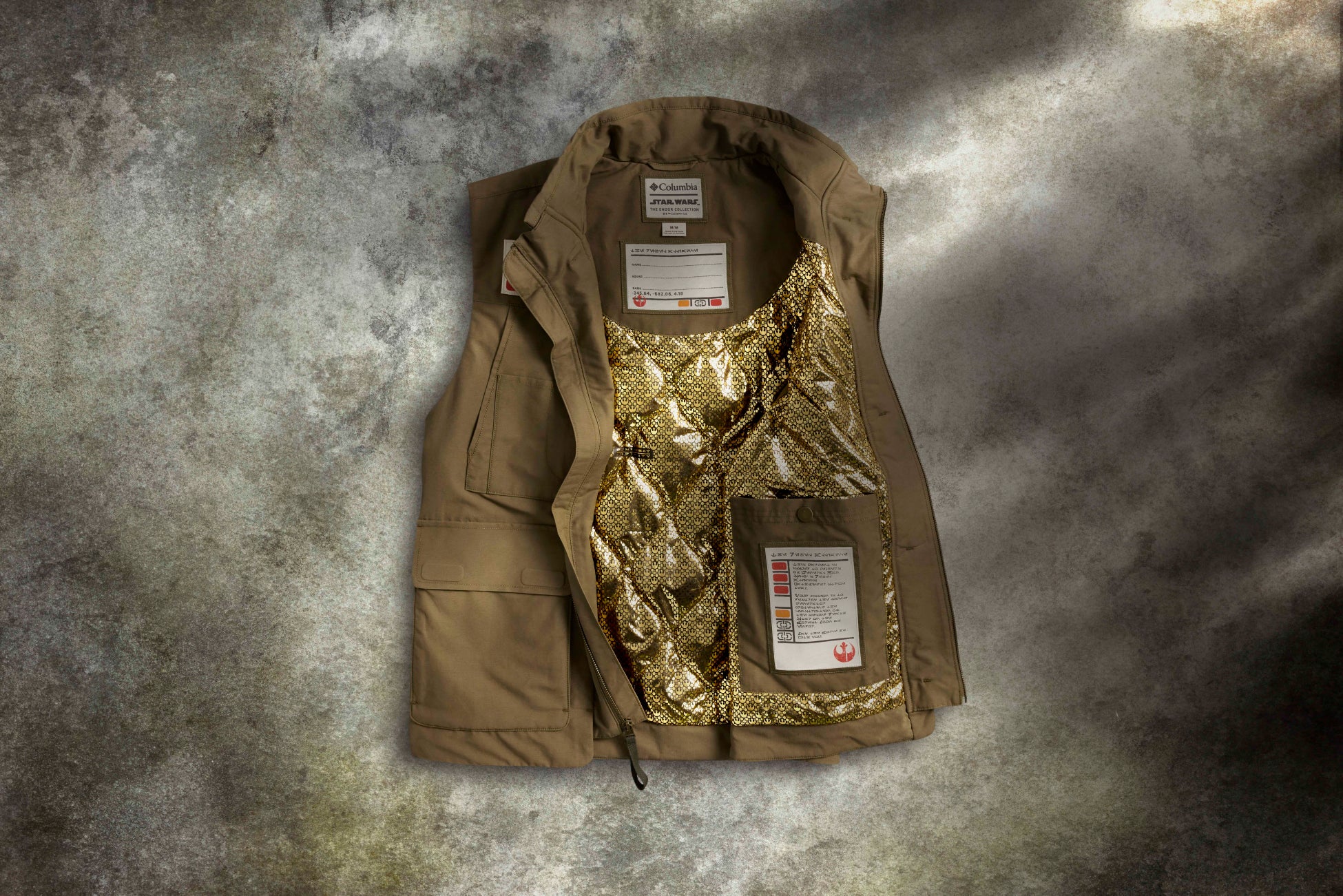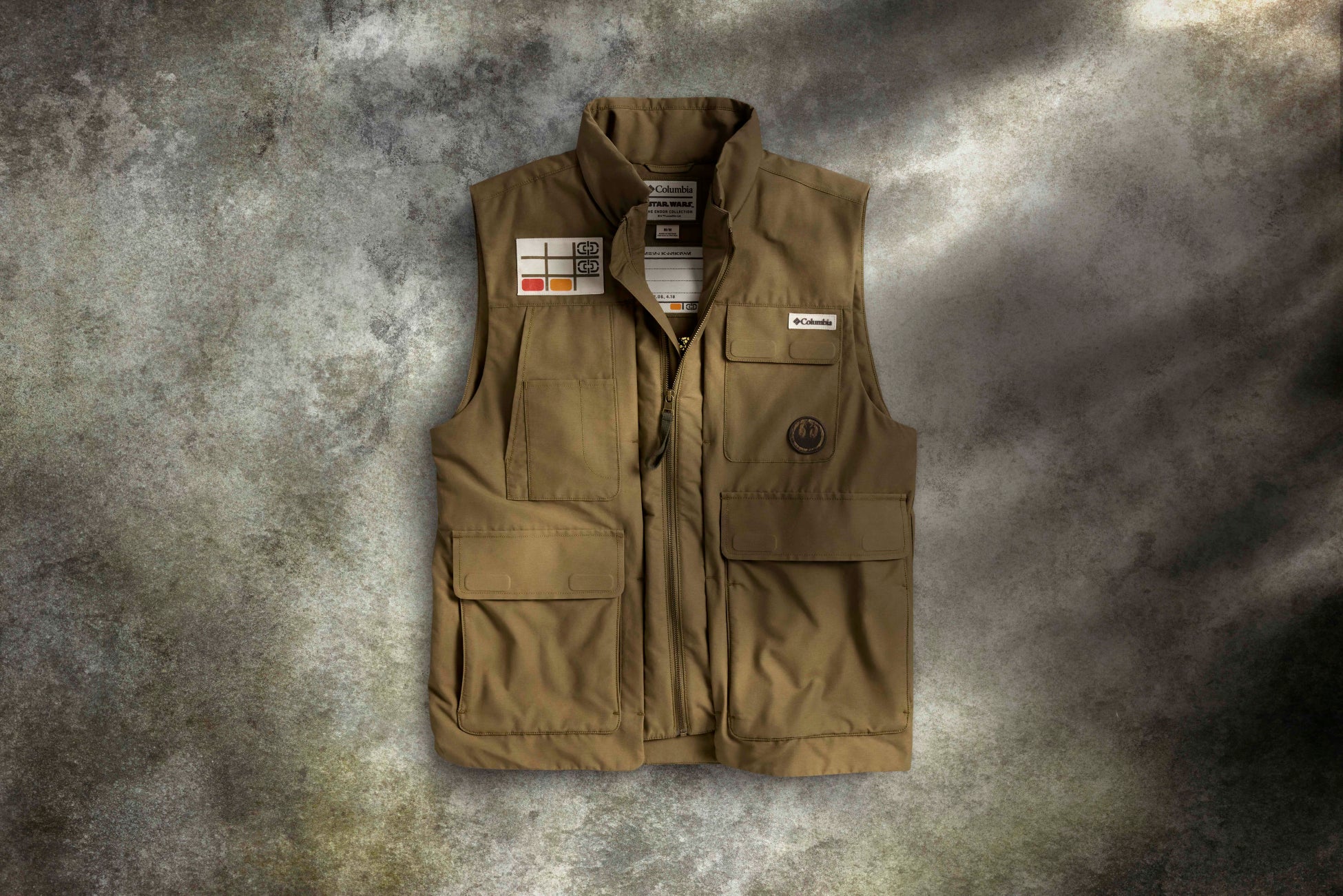 このカーゴジャケットは、「エンドア」の戦いでの反乱軍に着想を得たもので、同盟への忠誠を示す反乱軍の紋章や、内側の安全ポケットにはオーラベッシュ文字のメッセージなどのディテールと共に着回し自在なアイテム。ベストは、「エンドア」の戦いで反乱軍が身につけていた戦術装備にインスパイアされたもので、本コレクション限定の反乱軍ゴールド熱反射パターンを採用したコロンビア独自の熱反射保温テクノロジー・Omni-Heat Infinityを搭載。